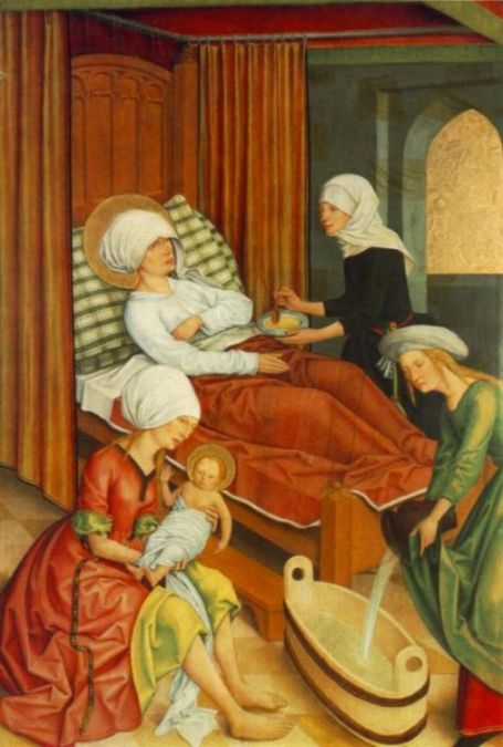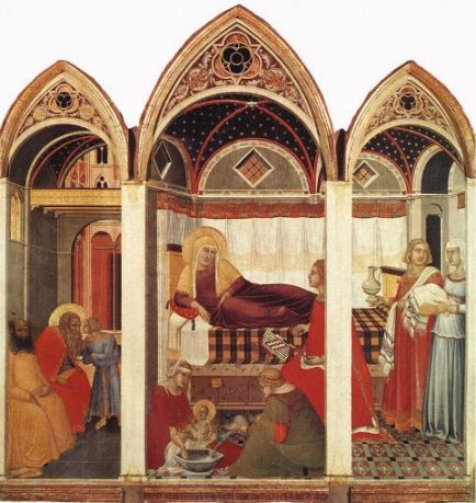 | イエスは粗末な馬小屋か洞窟で生まれたが、マリアは裕福なヨアキムの立派な邸宅で生まれた。絵画でもその違いは表れている。 | |