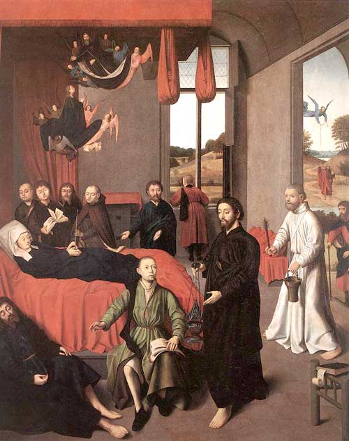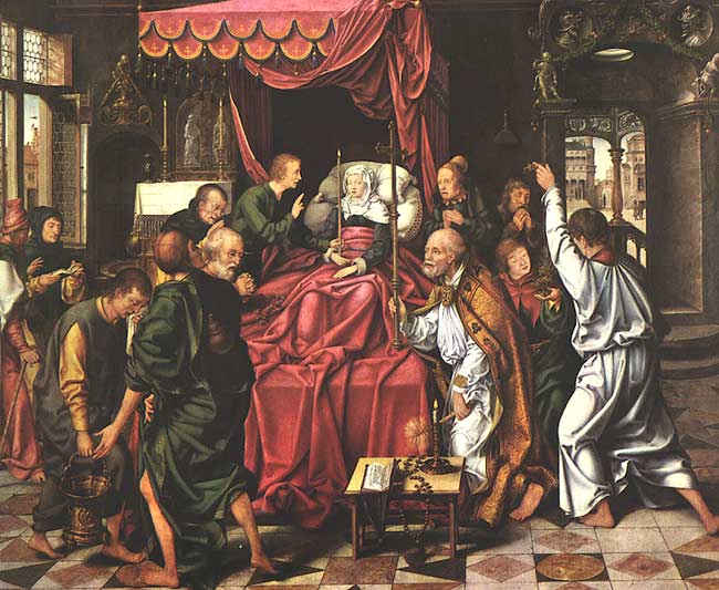 | 黄金伝説」によると、年老いたマリアは、息子に会いたいと願った。すると天使が来て、3日後に死ぬと預言した。天使は棕櫚の枝を持っている。その棕櫚の枝は、聖母の棺の前に添えられる。 聖母が死ぬ前に、懐かしい使徒たちに会いたいと願った。天子が使徒たちを雲にのせて運んでくる。 北方ルネサンスの絵画では、聖母は蝋燭を手に持っている。これは北方の習慣で、死につつある人間に蝋燭を持たせるのである。蝋燭の光はキリスト教の信仰の象徴である。 |