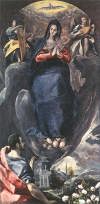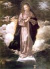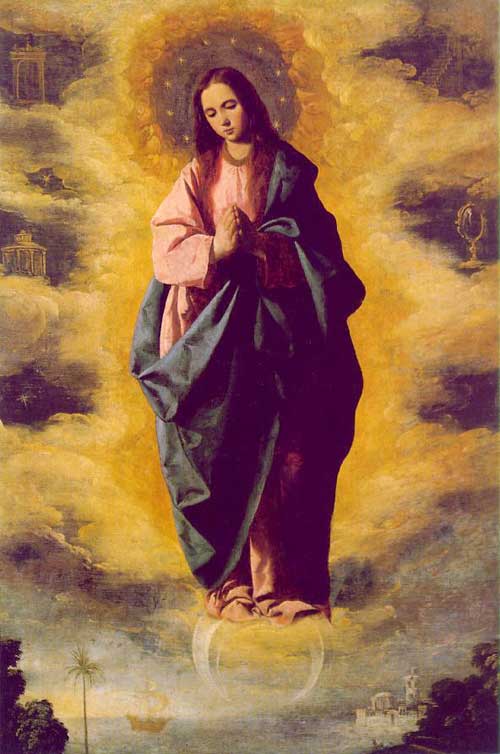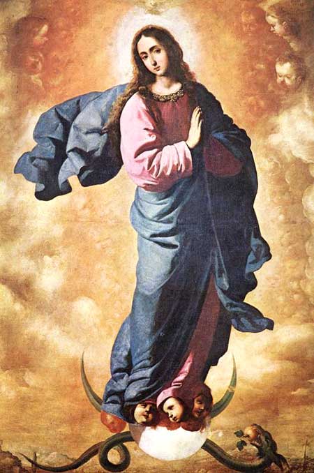 | 聖母マリアは原罪なしに生まれてきたとする教義。 キリストの母マリアは汚れなき存在であり、「情欲の交わりなしに」、母アンナの体に宿ったと説く。 これはキリストが、人間から生まれてきた聖なる人物だとするのに重要な考え方。 美術作品では、合掌した(もしくは胸に手を当てた)少女が足を三日月に載せ天空を降りてくる姿をして、17世紀に多く表された。 蛇を踏みつけているのは、「エヴァの罪」を人間から解き放つためである。 ヨハネ黙示録12:1から、子を宿した黙示録の女を聖母として、これに基づいて描かれる。 「太陽を着て、足の下に月を踏み、その頭には12の星の冠を被っていた」 スペインの画家フランシスコ・パチェコが書いた「絵画術」(1649)で、新しい図像表現について言及している。パチェコは、異端審問所付美術監督官であった。 「聖母は12,3歳の少女で、白い着物の上に青いマントを着け、手を胸に当てて祈っている。月は下向きの三日月とする(純潔を表す古くからの象徴)」 |