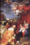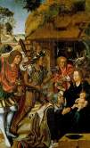 | 三賢王は、長老格の王ガスパール、青年の王メルキオール、黒人の王バルタザールである。聖書には書かれていない。 三賢王は中世後期、ヨーロッパ、アジア、アフリカの擬人像として描かれた。それらが、キリストに敬意を表す、という意味である。 |