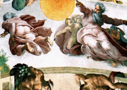 | 天地創造は創世記第一章に書かれている。 神は六日間で世界を創った。第一日目、神は光と闇を創った。次に海と空を分けた。四日目に空に太陽と月を置き、五日目に動物を創った。 そして六日目に自分自身をモデルに人間を創った。7日目、神は自分の仕事が終わったことを確認し、祝福し、休息をとった。 |