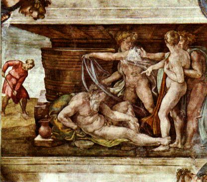 | ノアに関して、もう一つのエピソードがある。名画にもよく登場する。 洪水の後、ノアはワインを造る方法を見つけた。ある日、ワインを飲みすぎて、裸のまま寝てしまった。 彼の息子ハムは他の兄弟を連れてきて父親を笑った。 しかし、セムとヤペテは父親の裸を見ないように、後ろ向きで歩いて父親に近づき、着物をかけてやった。 父親のノアは、ハムの無礼な行為を怒り、ハムに対して「お前の兄弟の奴隷達の奴隷として仕えろ」と呪いをかけた。 |