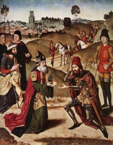 | アブラムは80歳になっていた。 いとこのロトはヨルダン川低地の町ソドムに住んでいた。 ロトの住むソドムが略奪にあい、ロトも捕らえられた。アブラムがそれを聞き、自らの民を武装させ、敵を追い払った。略奪された品物や捕虜となった者たちのすべてを返した。 ソドムの王は、アブラムが返した略奪品をすべて、彼に与えると言ったが、アブラムは断った。 祭司のメルキゼデクがパンとぶどう酒で、アブラムを祝福した。 |