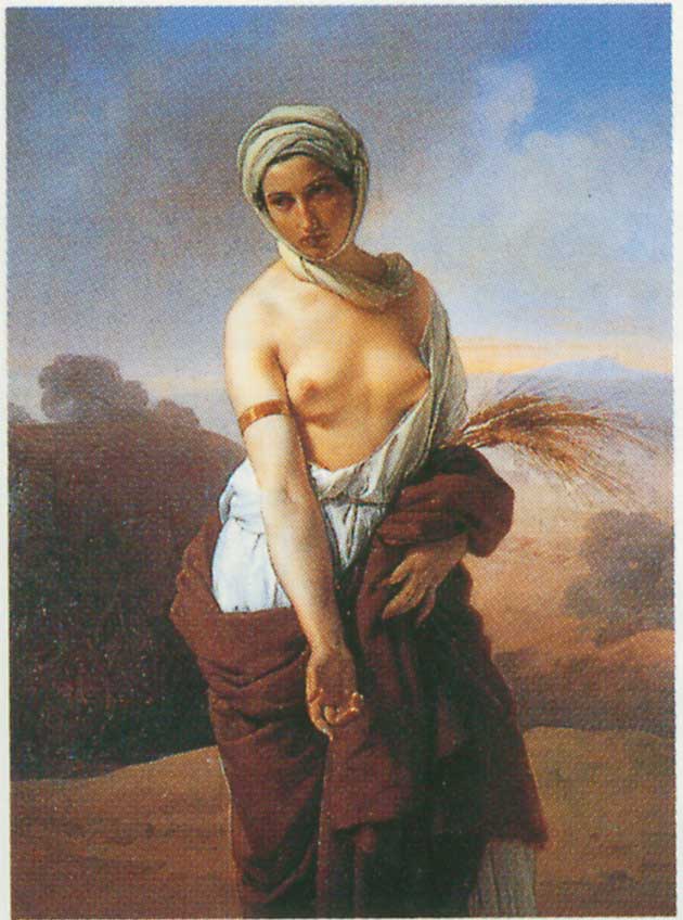 | 士師の時代。ベツレヘムで飢饉があった。エリクメルと妻ナオミは、ヨルダン川の東、モアブの野に逃れた。 息子がモアブの女を嫁にした。ルツである。 しかし、エリクメルも息子も死んでしまい、嫁のルツと姑のナオミが残った。ナオミは国に帰ろうとしたとき、ルツを実家に返そうと思ったが、ルツはナオミに着いて行った。 ベツレヘムへ帰ったのは大麦の刈入れの時期であった。 イスラエルの律法には、「落穂は貧しい人のために残しておき、畑主が拾い集めてはいけない」とある。 ルツはボアズの畑に行き、落穂を拾わせてもらい、姑ナオミの面倒を見た。 畑主のボアズは、ルツのそうした姿を見て心を打たれ、ルツと結婚した。 ルツとボアズの子がオベドといい、その子がエッサイで、エッサイの子がダビデである。 |