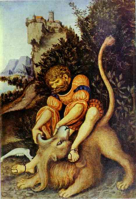 | ヨシュアの死後、イスラエルは部族を取りまとめる後継者がいなかった。世代が代わっていくごとに、神とともに闘った時代を忘れ、異教の神を崇拝するようになったりして、神を怒らせた。 神は制裁を加えるが、反省と信仰を取り戻すと、士師たち部族の救済者として送った。 サムソン サムソンは士師記のヒーローである。驚くほどの力を持っていた暴れ者である。この時代、イスラエル人は神の制裁の下、ペリシテ人に支配されていた。 サムソンとライオン サムソンは襲ってきたライオンを捕らえて、手で引き裂いた。その死骸に蜂が群がり蜜が溜まった。 |