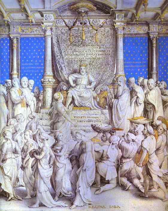 | ソロモン王の智恵とその国の繁栄を知り、南の国シバの女王が多くの贈り物を持ってやってきた。 この場面はキリストが生まれたときにやって来た、三賢王の礼拝の場面に対応する。 |
