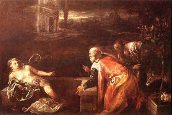 | 美しい若妻スザンナが沐浴しているときに、長老二人が近寄り、言い寄った。 スザンナは拒絶した。 逆恨みした長老たちは、スザンナを姦通罪で訴えた。死刑になってしまう。 預言者ダニエルは二人の長老を尋問し、矛盾を暴き、スザンナの無実が実証された。二人の長老は死刑となった。 |