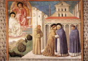 | ゴッツォリ 「聖フランチェスコの生涯 6.聖ドミニクスとの出会い」 1451−52 |サン・フランチェスコ聖堂 モンテファルコ フレスコ |