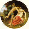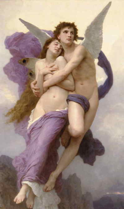 | 三人姉妹の末娘。 あまりの美しさにアフロディテが嫉妬心を燃やす。アフロディテは息子エロス(クピト・キューピット)を送り、ある醜い豚飼いに恋をするよういいつけた。しかしエロスは誤って、自分の胸を、恋の矢で傷つけてしまった。プシュケに恋したエロスは、彼女を自分の住処に運び、結婚した。 神が人間と結婚するためには、その姿が人の目に見えないようにしなくてはならない。人間は神の火に打たれて死んでしまうから。 プシュケは夫の姿を見たことが無いが、すばらしい宮殿に住んでいた。夫は朝になると去っていった。 彼女は姉たちを呼び、彼女の幸せな様子を見せた。姉たちは彼女に夫が、恐ろしい怪物ではないか、など疑惑の念を持たせることを言った。 プシュケは疑念でいっぱいになり、ある夜、エロスが眠っているとき、ろうそくに火を灯し、夫の姿を見てしまう。夫は今まで見たこともない美しい青年であった。しかし、ろうが夫の肩に落ち、エロスが眼を覚ましてしまう。 エロスはプシュケをじっと見つめた。怒りはなく、深い悲しみと憐れみの表情であった。プシュケは気を失ってしまった。 プシュケが目覚めたとき、城も中庭もなく、雑草の中であった。夫とともにすべて消えてしまった。彼女は森の中をさまよいあるいた。 伝説では夫が彼女を許し、彼女をオリュンポスの山へ連れていったという。そして花嫁と花婿の身内のものが、おせっかいなおしゃべりを封じるのが彼女の仕事となった。 相手を疑い、自分で見届けるのが一番、とか百聞は一見にしかず、などと言っている連中に姿を見せずに近づき、「愛だけが愛する人の秘密を知る、信じることは見ることなのよ」とささやくということである。 |