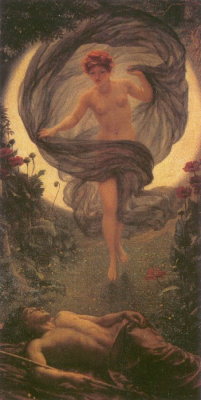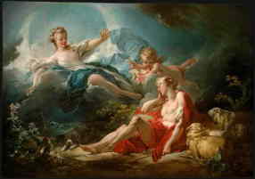 | ラトモス山で羊の群れを飼っていた美青年エンデュミオンは、ゼウスから永遠の若さを与えられた。エンデュミオンは、その永遠の若さと引き換えに、永遠の眠りに就く。 ある日、月の女神ディアナ(アルテミス)が、眠っているエンデュミオンを見た。その美しさに、冷徹な純潔を持ったアルテミスでさえ、恋に落ちてしまった。アルテミスは夜ごと、月から下ってきて、エンデュミオンを抱擁した。 永遠の眠りに就く美少年エンデュミオンは、美の永続性の象徴として、芸術家たちの想像力をかきたてた。 |