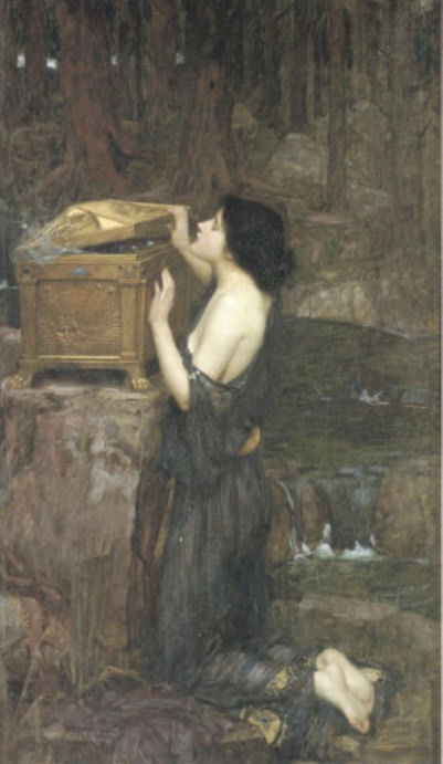 | アテナは知恵を、アプロディーテは美しい肉体を、アポロンは美しい歌声を与えた。そしてヘルメスは美しい彫刻を施した金の箱を与え、決して開けてはいけないと言った。そのあと、ヘルメスは彼女に「好奇心」を与えた。 |