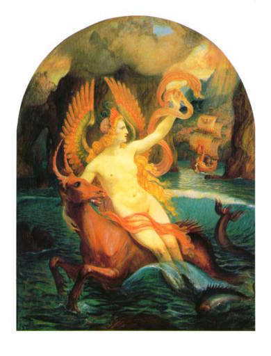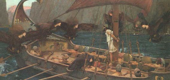 | 半身女性で、半身が鳥(のちに魚)の三人の姉妹。鳥の翼を持ち、美しい歌声で船乗りたちを魅了する。 この歌声を聞いた船乗りは、岩に船を衝突させてしまう。 オデュセウスはこのことを、魔女キルケから警告されていた。 オデュセウスはともの水夫たちの耳に蝋を詰めて、歌声が聞こえないようにした。そして、自らは、身体をマストに縛り付けた。 オデュッセウスはセイレンたちの美しい姿と歌声が聞こえるとたまらなくなり、マストを引き抜き海に飛び込んでしまいそうになった。幸い仲間が彼を押さえつけてくれたので、無事、その海域を通過することができた。 ちなみに、セイレーンは「サイレン」の語源となっている。 |