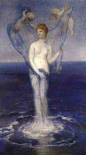 | 恋の女神。彼女の仕事は欲望をかきたてることだけで、恋が職業である。 アフロディテとは「泡から生まれた」という意味。 神々の父クロノス(時)が、父親のウラノスを殺し、海に投げ捨てた。その身体から出た血は白い泡となり、そこからアフロディテが生まれた。 はじめに殺害があり、そこから愛の女神が誕生したことになるが、これは命が不滅だというギリシャ人の信念の表れでもある。 アフロディテは、背が低く醜い鍛冶の神ヘパイトスと結婚し、皆を驚かす。ゼウスが、息子のヘパイストスが雷を作ったので、その褒美にアプロディテを妻に与えることにしたのである。 しかし、アプロディテは恋の神であるから、多くの父親の違う子を産んだ。 多くの情事を重ねても、彼女はヘパイトスの元に戻り、彼はいつも許した。 リンゴ、バラ、カリン、白鳥、鳩がアフロディテの聖なる植物と動物である。七惑星のなかでは金星の女神。 エロス(キューピッド・クピド)はゼウスとの息子。 三美神は彼女の従者 |
