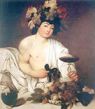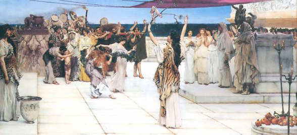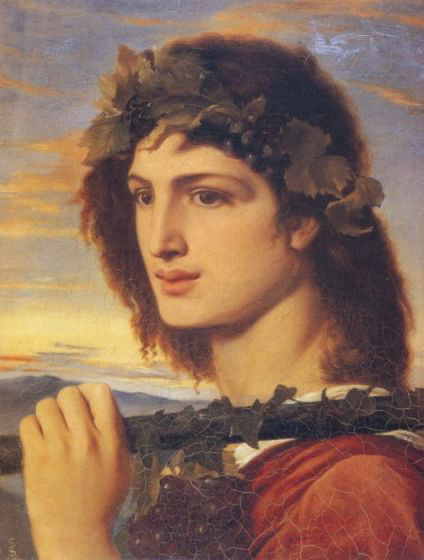 | ぶどうの神、祝祭の主、エクスタシーを与える本尊である。 ディオニュソスは人間を愛し、彼の祭りは格別に楽しかったので、他の神々もそのお祭り騒ぎに加わったほどである。 ぶどうとつた、バラがディオニュソスの聖なる植物である。ひょう、山羊、いるかが聖獣である。 ときにリュシオス(ゆるめるもの)と呼ばれた。彼のぶどう酒が、人間たちを日々のかせから開放するからである。 |