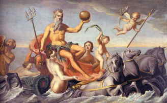 | 海の神。クロノスとレアの息子で、ゼウスの兄弟。 オリュンポスの神々の中でも、最も恐れられている。人間たちは彼のことを「大地を揺るがすもの」と呼んだ。 ポセイドンの威力の象徴は三叉の戟(ほこ)である。気分屋で、闘争好きな反面、愛情豊かで、親切でもあった。 船乗りや漁師たちに恩恵を与える一方で、気が変わると、嵐を起こし、船を難破させたりした。 いろいろな生き物を創る才能があり、たこ、ふぐ、イソギンチャクなどは、海のニンフを喜ばせるために創った。 妻になったアンピトリテにはいるかを創り、デメテルには馬を創った。 ポセイドンは海のそばに住む人々に畏敬されただけではなく、津波はかなり内陸まで達することから、内陸に住む人々にも恐れられた。 「安全な旅路を与える者」として、馬がポセイドンの聖獣である。また、船を生み出す父、ということで、松の木が、ポセイドンの聖木であった。 |
