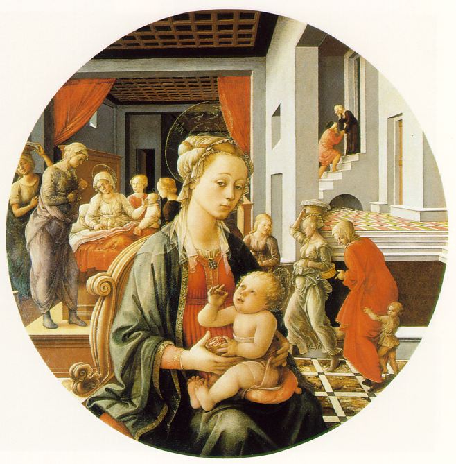 聖母子とマリア誕生の物語(トンド・ピッティ) 1452 Oil on panel, diameter 135 cm フィレンツェ、ピッティ美術館