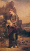 | バッコスの信女たちによって八つ裂きにされ、竪琴とともに流れ着いた詩人のオルフェウスの首を拾い上げるトラキアの若い娘。 | |||||