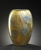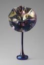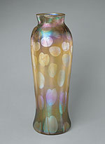 | ヨーロッパが主流だったアール・ヌーボーは、アメリカでは不毛であった。どうしてもヨーロッパ趣味直輸入の感があったが、そこで一人、ティファニーは精力的な活動をした。 1878年、商会を設立し、特にガラス器は世界的に名声を得た。特に「ファブリル・グラス」は有名。古代ガラスの玉虫色の光彩からの発想で、金属的な輝きと不透明の色彩に特徴がある。 |