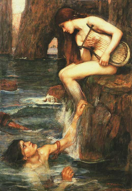 | 半身女性で、半身が鳥(のちに魚)の三人の姉妹。鳥の翼を持ち、美しい歌声で船乗りたちを魅了する。 この歌声を聞いた船乗りは、岩に船を衝突させてしまう。 オデュセウスはこのことを、魔女キルケから警告されていた。 オデュセウスはともの水夫たちの耳に蝋を詰めて、歌声が聞こえないようにした。そして、自らは、身体をマストに縛り付けた。 オデュッセウスはセイレンたちの美しい姿と歌声が聞こえるとたまらなくなり、マストを引き抜き海に飛び込んでしまいそうになった。幸い仲間が彼を押さえつけてくれたので、無事、その海域を通過することができた。 ちなみに、セイレーンは「サイレン」の語源となっている。 |